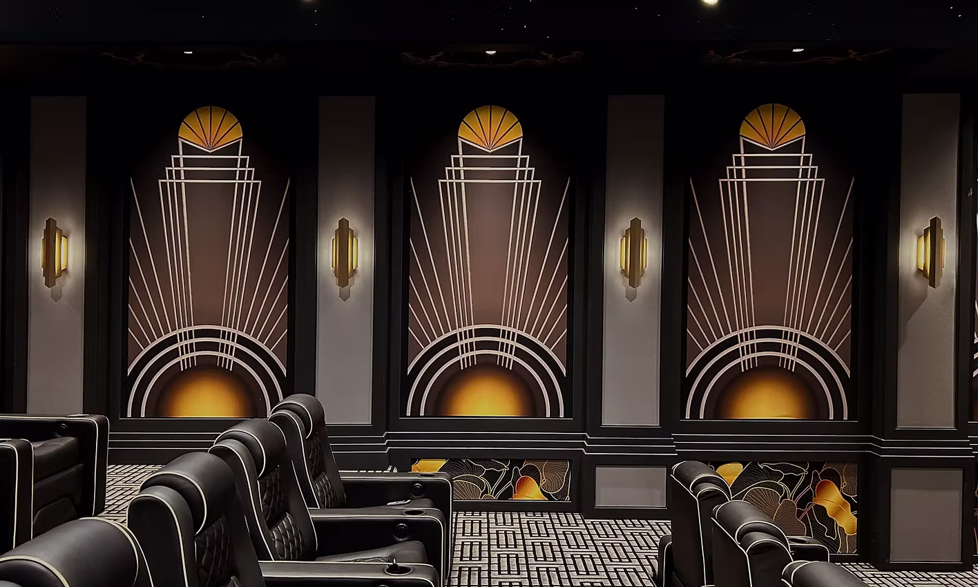 Art Deco interiors give a glamorous feel to your theater. Use geometric patterns, rich fabrics, and metallic accents like brass or gold. Combine it with dim lighting and bold contrasts to give your theater an elegant mood.